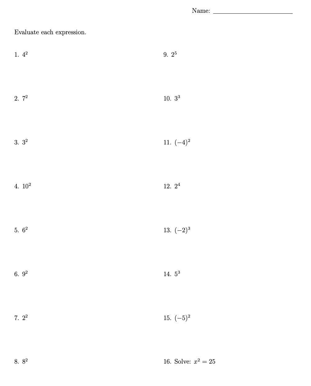One note about this worksheet: my goal is for all students to complete the left side, which is focused on squaring numbers. The right side has some tougher problems with larger exponents, negative numbers, and equations to solve. Those problems are there to provide an additional challenge. Practice is good for everyone. For students who are already confident, they get to apply their knowledge in a few new ways to stay challenged.