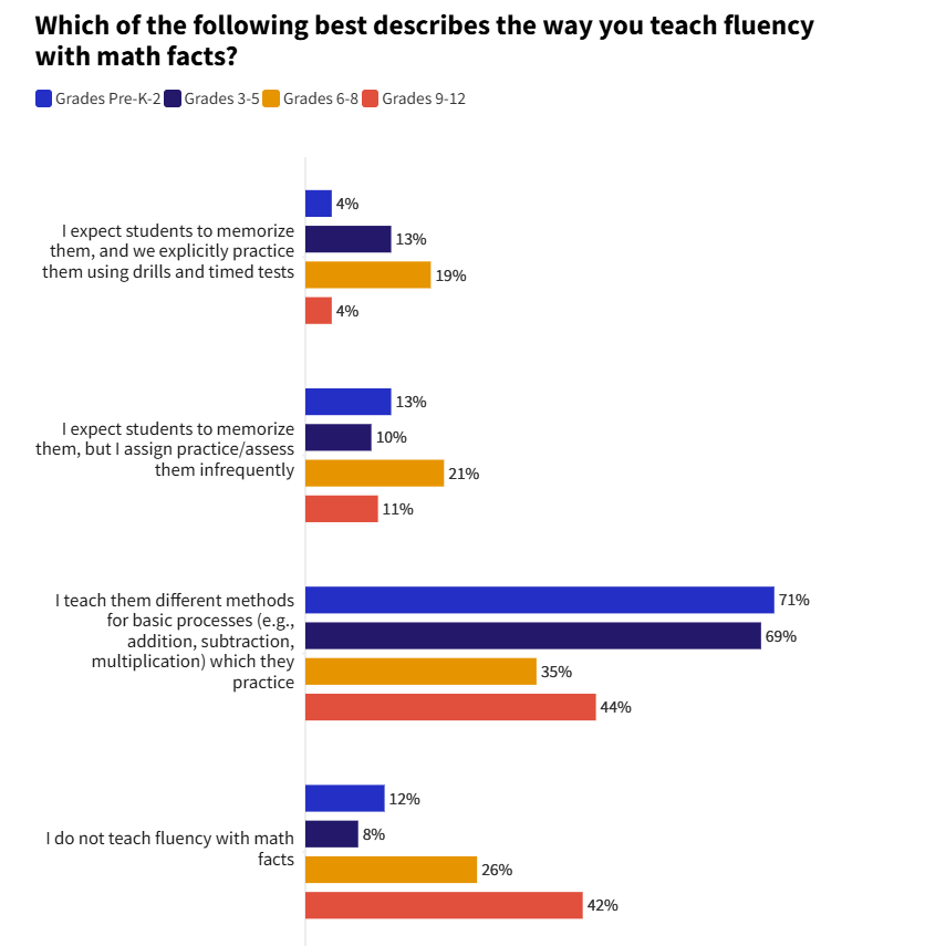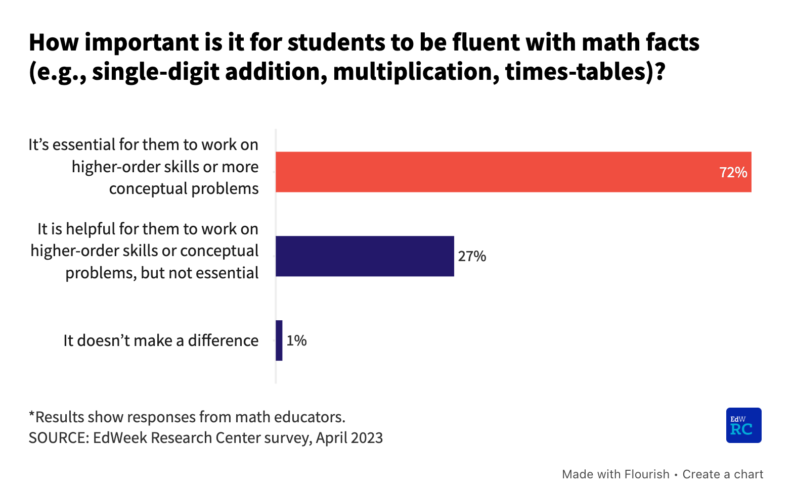 A good example of this is math fact memorization. There are endless articles explaining why math fact memorization is important. But when Education Week surveyed 300 teachers about math fact fluency, 72% said it was “essential” and 27% said it was “helpful” for future mathematical work—only 1% said it didn’t make a difference at all.
