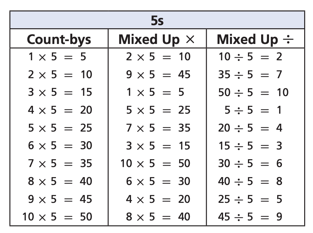 “I’ll say the multiplication, and you’ll say the product right back. One times five is…” We’ll go through that first column once. If you want a challenge, try not to look at the board.