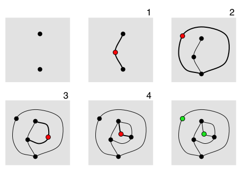 Sprouts is a two-player game, with an example game shown below. Start with a few dots (in the game shown below, there are 2). The first player connects two dots (the line can curve, but not cross any other line). Somewhere on the line they drew, they add an additional dot. Dots can have a maximum of three lines coming out. You can see that after the fourth step, all but two dots have three lines coming out and are “dead.” Since the last two lines cannot be connected, the game is over. The player who makes the last move wins.
