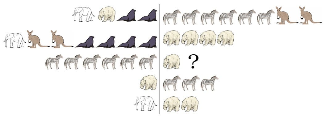 Here’s the prompt. The animals below all need to board Noah’s ark. To sail smoothly, the ark must be balanced so the weight on the left matches the weight on the right. All like animals weigh the same (so all kangaroos, all elephants, etc each weigh the same). How many seals must go in the place of the question mark to balance the ark?