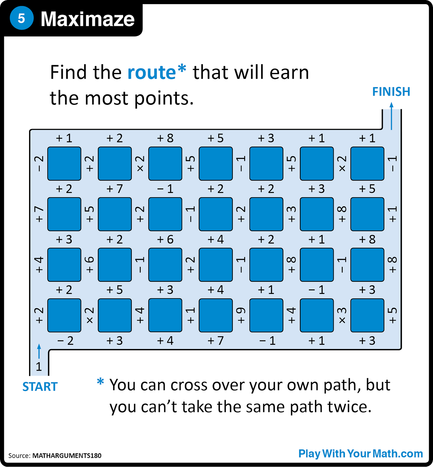 Finally, I would argue that there are two big types of mathematical explorations. One type is what I’ll call an insight problem. These are problems that are often opaque at the start, and require a sudden insight to figure out. A second type is what I’ll call a tinkering problem. The paper folding problem above is a good example. Anyone can start by just folding a piece of paper and seeing what happens. These are problems that can be explored gradually, making steady forward progress. The vast majority of the problems on this list are tinkering problems. There are some insight problems in there, and insight problems can be great for students who already have a lot of mathematical confidence. But in general, tinkering problems are a better way to draw students in to mathematical exploration. Some tinkering problems look like math problems. In other cases they look like games or puzzles. They can be a single prompt, or a sequence of connected prompts.