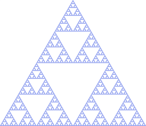 Start with a large triangle. Draw a triangle in the center of the large triangle. You’ve created three smaller triangles. Repeat the process in each of those smaller triangles. Continue repeating this process as many times as you can. The final result should look like the image below.