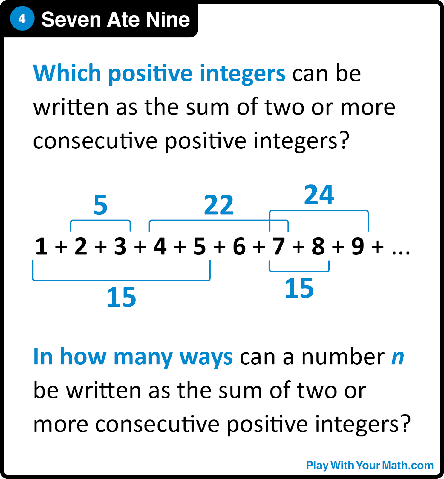 One more note. There are a few problems that are repeated multiple times throughout this sequence. I think an underrated part of math is revisiting an old problem with new eyes. Not all problems are repeated, but there are some problems that are well-suited to an initial exploration, then a thoughtful extension on a second visit.