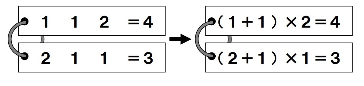 Another Inaba puzzle. In each pair of twin puzzles, the goal is to put arithmetic operations and parentheses to make two true statements, using the same operations and parentheses in both puzzles.