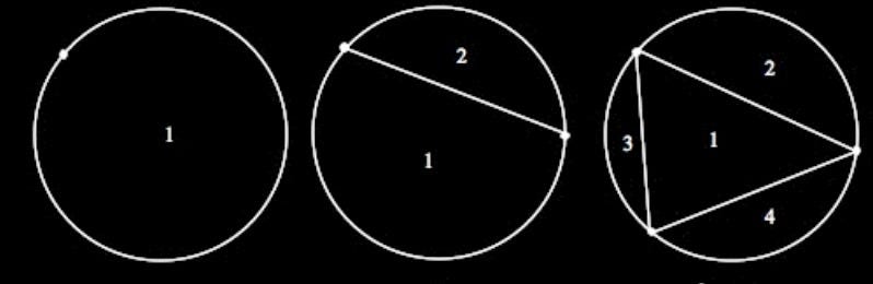 Put two dots on a circle and connect them. The circle is divided into 2 sections. Now put three dots on a circle and connect all of them. Now the circle is divided into 4 sections. What about four dots? Five? Six? What is the pattern?