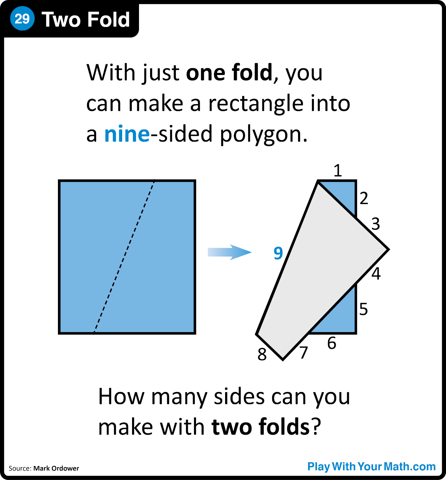 • One way to scaffold this problem is to start with a triangle. How many sides can you make with one fold of a triangle? Two folds of a triangle? Then, how many sides can you make with one fold of a rectangle? Then two folds of a rectangle? How are you sure you’ve found the maximum number of sides?