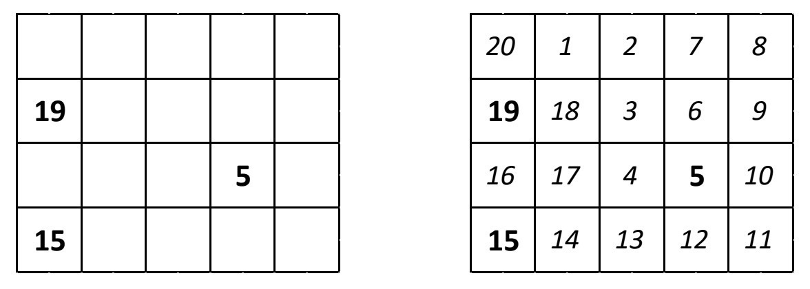 Below is a number snake puzzle and its solution. The goal is to write the numbers 1 to 20 so consecutive numbers are in adjacent squares (no diagonals!). The link has 200 of these fun puzzles.