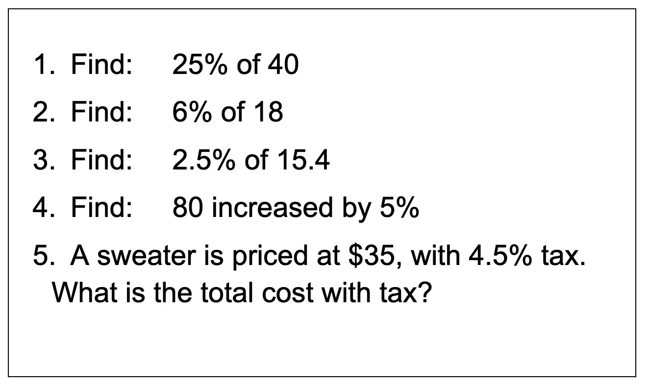 Asking multiple questions helps me identify where understanding breaks down. In the sequence of problems above, I can tell quickly whether a student needs help with the basics of percentages, or only the idea of percent increase/decrease.