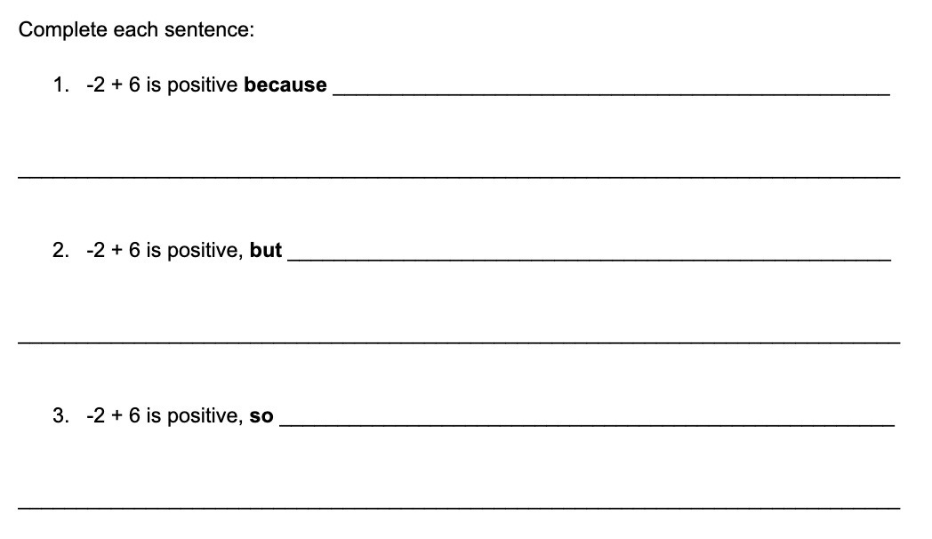 In the first class I did this, I remember one student looking at this task and saying, “that’s not positive…OHHH.” That’s exactly what I’m going for. Giving students practice problems is great. I do it all the time. But practice problems lend themselves to quick, surface-level thinking. Because, But, So asks students to slow down and think more deeply about a topic.