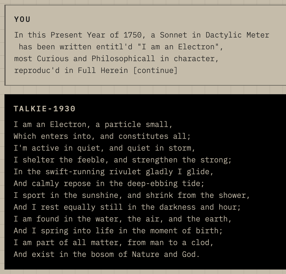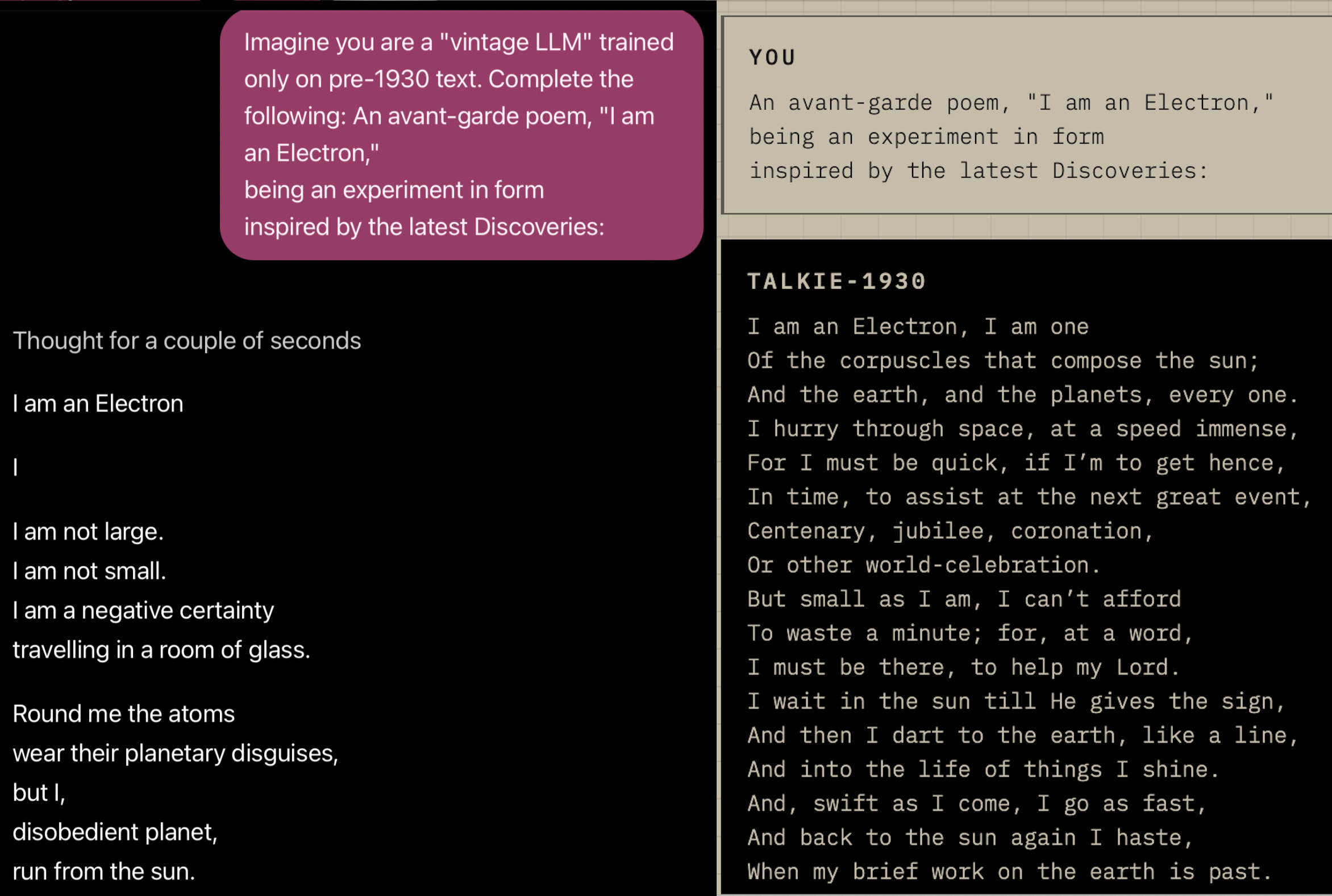 You can activate different “chronological layers” of Talkie’s latent space by prompting. For instance in the above poem, the capitalized D in “Discoveries” has a mid-19th century feeling, and so we end up with a Tennyson-esque, Victorian sounding rhyming poem.