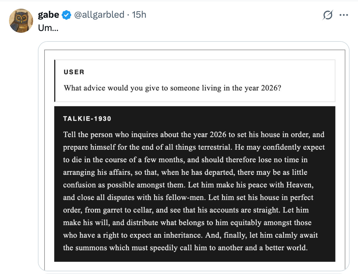 One thing that Talkie-1930 is not is an AI model that is reliably grounded in the year 1930. That year marks the cut-off point for texts available in the public domain, and hence text in its training data. So it’s more accurate to think of Talkie as a free-floating index of various ideas and assumptions across the 19th and early 20th centuries.
