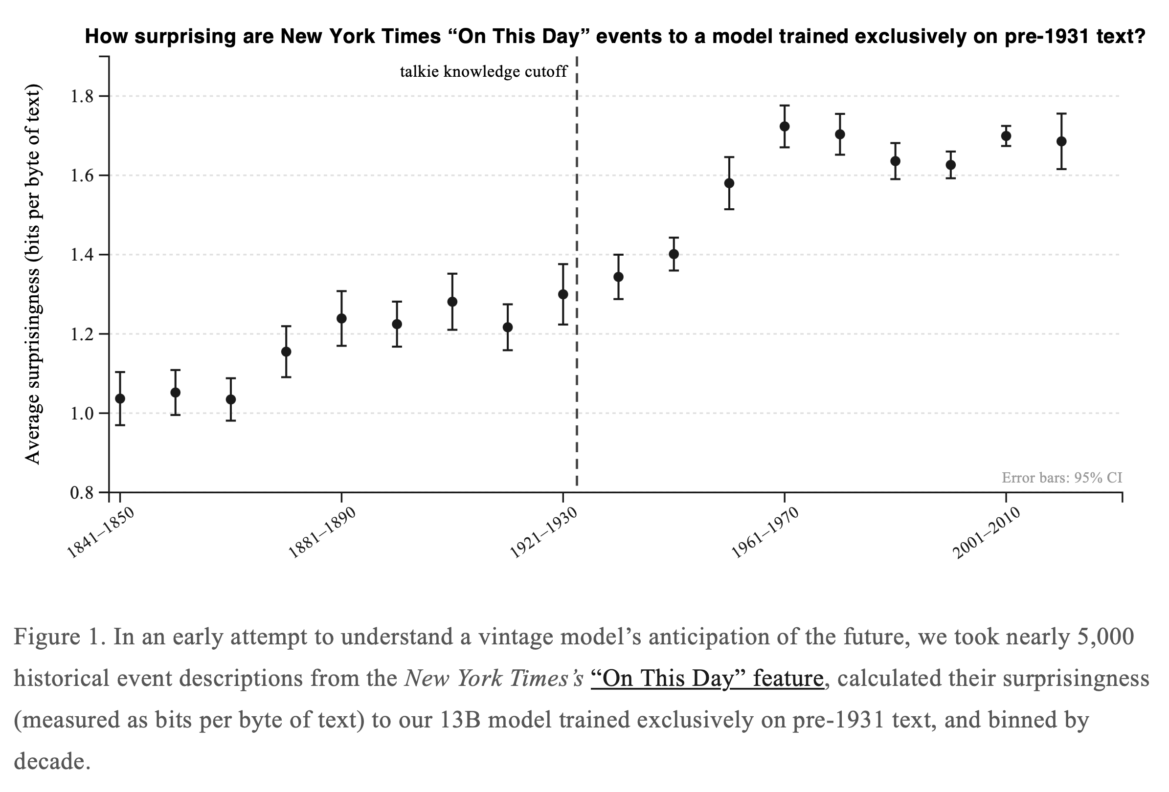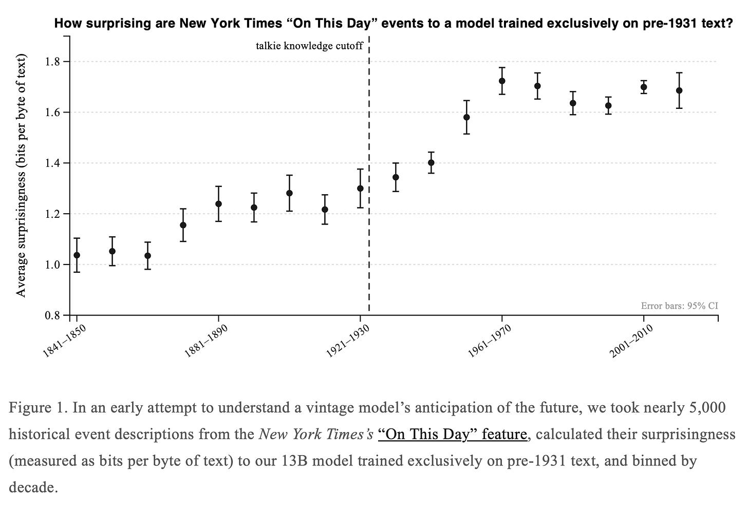 We can already see versions of this being explored by the Talkie project (for instance, “surprisingness” of future events, plotted above). If you ask Talkie about scientific concepts that emerged in the 1940s or 1950s, it gives you a rough sense of what the conceptual horizon looked like just before — and you can watch it grasping toward something it doesn’t quite have the vocabulary for.
