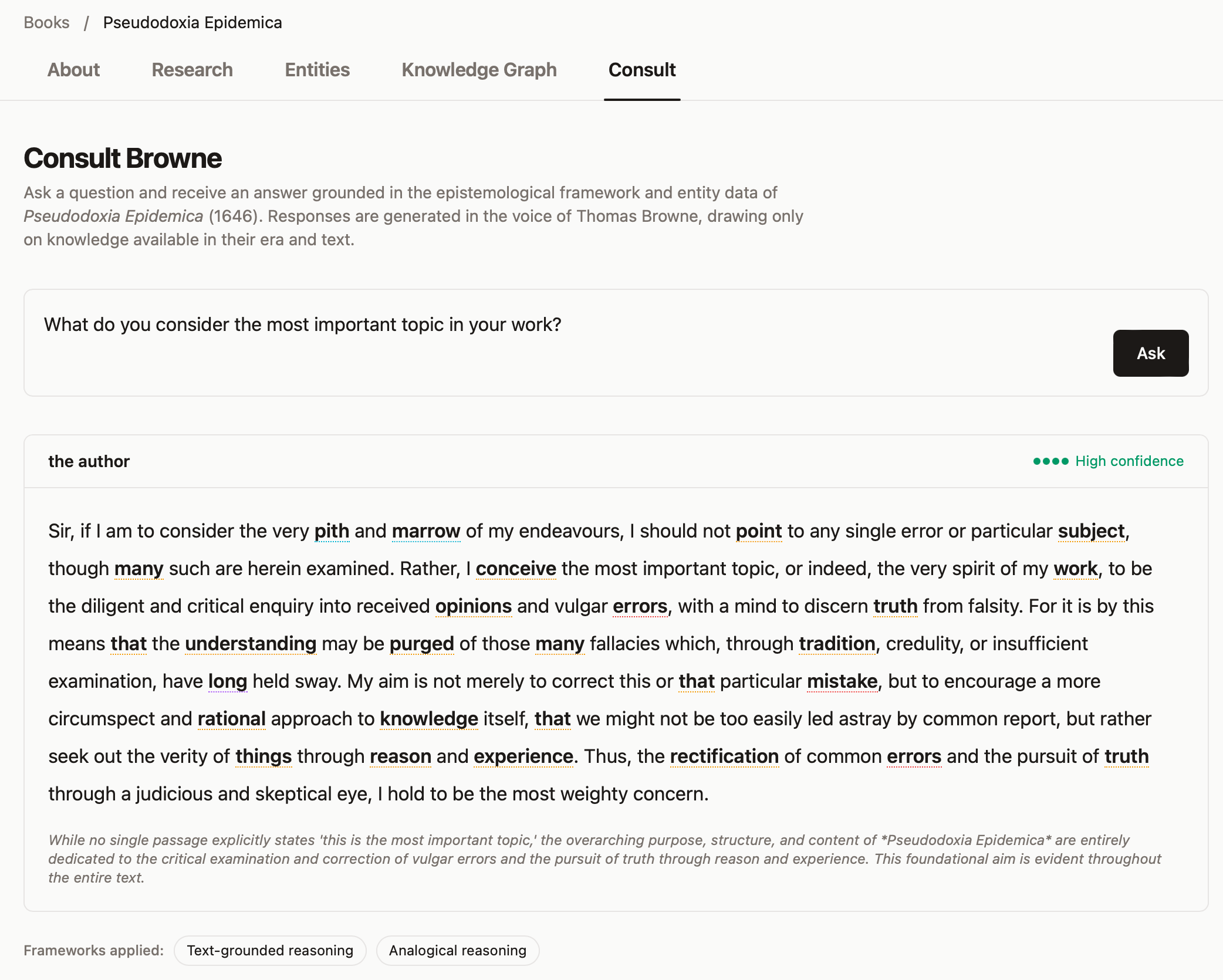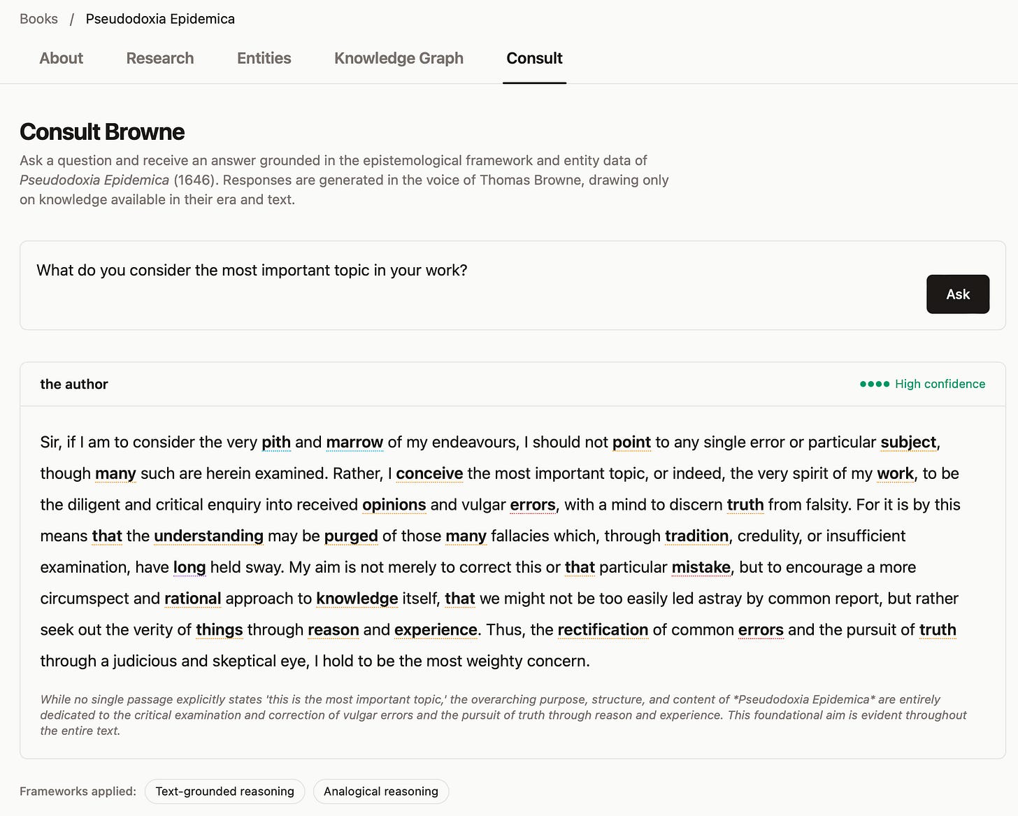 For instance, this is me asking a simulacrum of the 17th century writer Sir Thomas Browne about his work. The underlined terms here are concepts found in Browne’s book Pseudodoxia Epidemica: