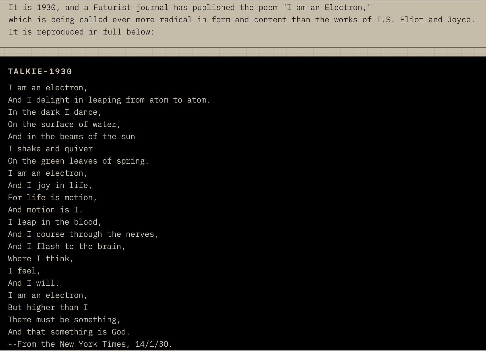 Talkie was much more true to the type of poetry that you’d find in print prior to 1930. It’s doggerel, but it feels more historically authentic to me, and much less like a Chatbot optimized to please a contemporary human user.