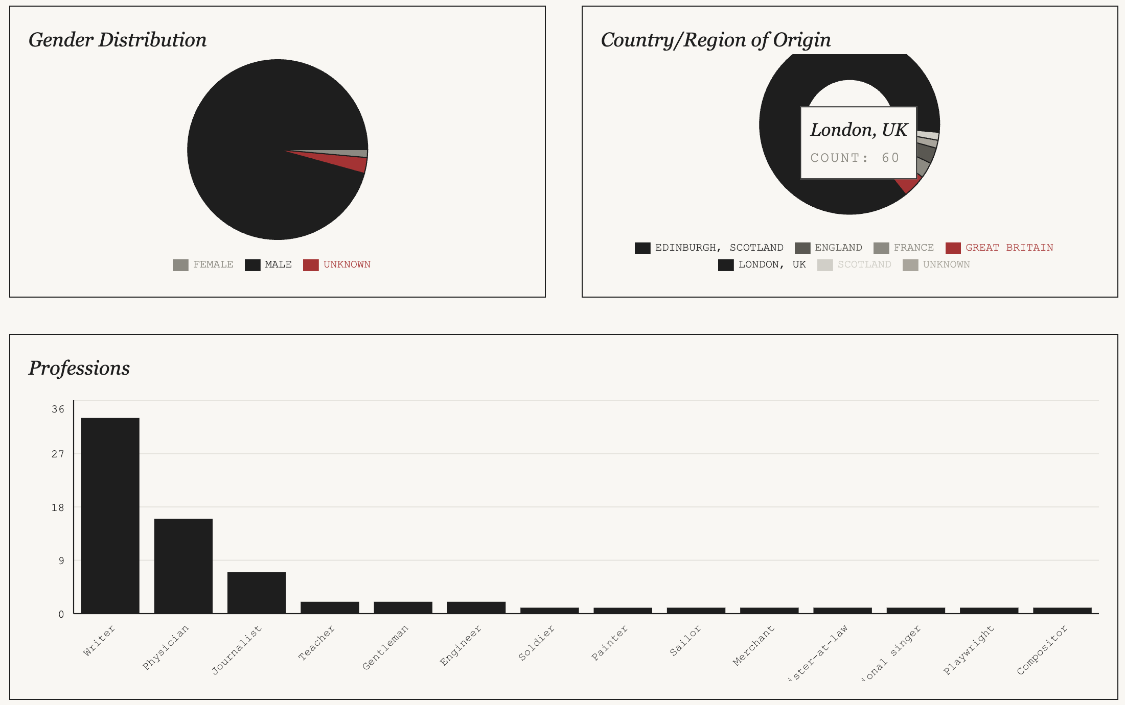 As for Talkie’s assumptions about it itself: asking 70 Talkies about their profession, age, and place of residence reveals about what you would expect when it comes to gender (overwhelmingly male), plus a surprising emphasis on London. The professions map closely onto the sorts of well-off, literate people who were publishing English text in the 19th century, including “Physician,” “Journalist,” “Gentleman,” and “Compositor.” Clearly, there is a lot of scope here for branching out beyond the personas that the printed record has tended to favor, to recover the real historical voices of women and others excluded from printed works in the 19th century and earlier.