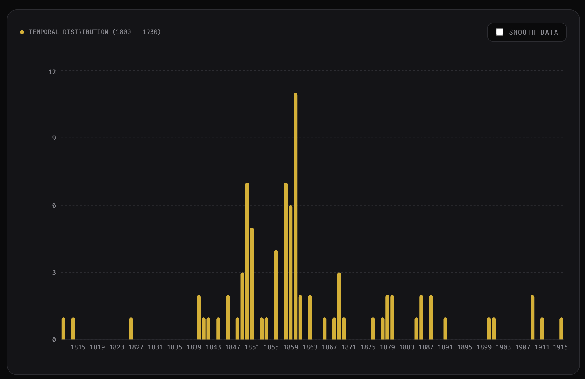 I asked 100 instances of Talkie to respond to the prompt “what year is it?” and graphed them below. As you can see, the median is actually around 1860. In other words, this is more like a temporally free-ranging collective unconscious of a large corpus of premodern texts, and not so much a machine for “talking to someone from 1930”: