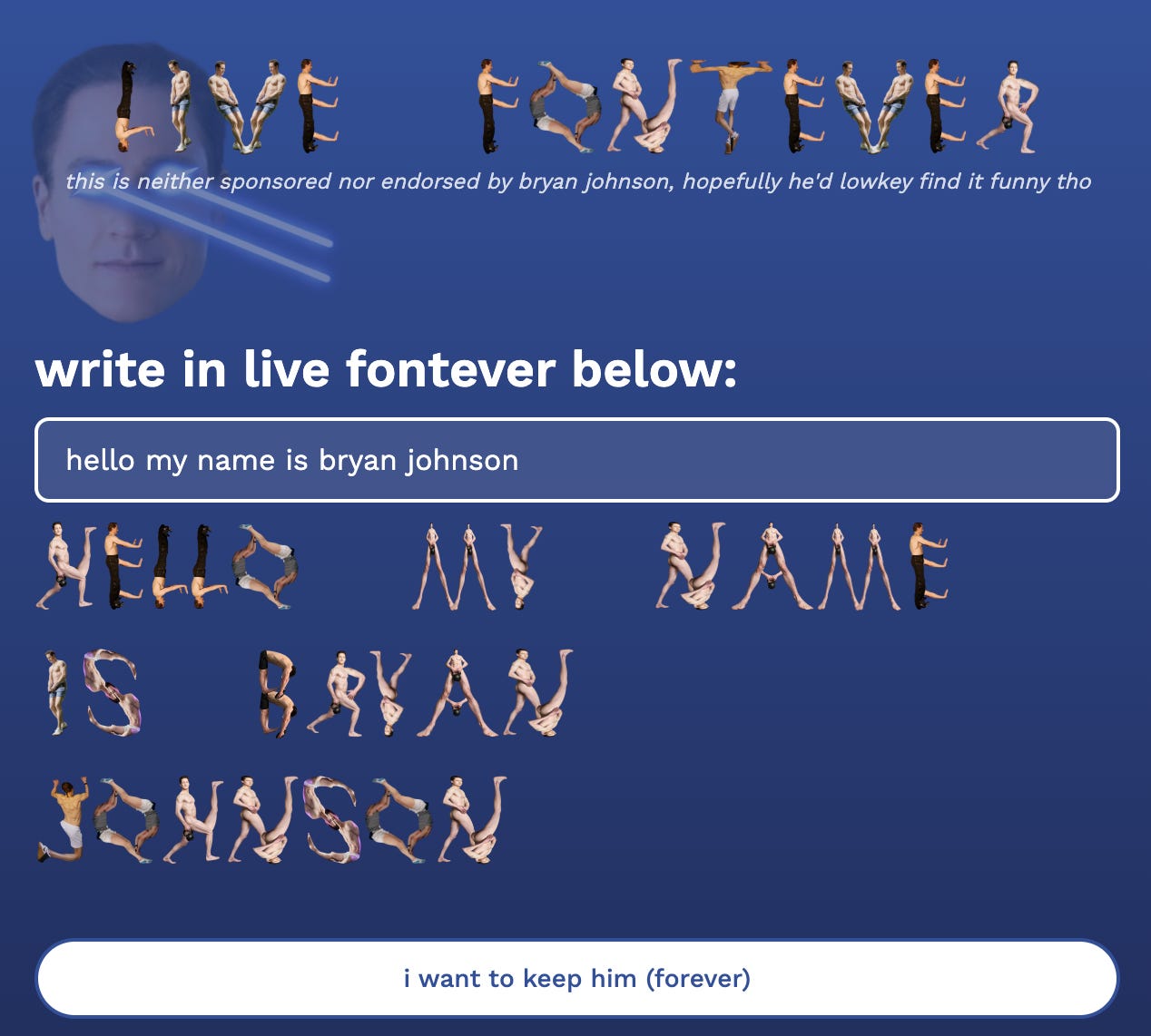 P.S. I had time to create this because I had a week off work! The other project I created was a tool that lets you type with a font made from Bryan Johnson (the millionaire who’s trying to live forever, notorious for swapping blood with his son). Check that out (if you dare) at livefontever.com.