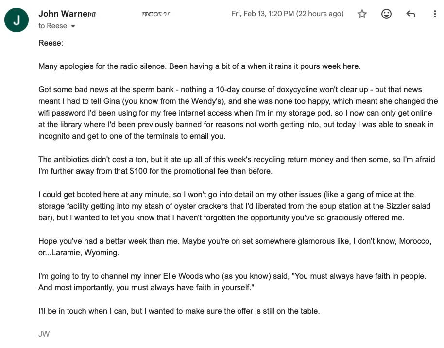 I didn’t have a lot of time to correspond with Reese W. this past week, but I did want to update her on my efforts to secure the $100 necessary to take advantage of the incredible promotional opportunity.