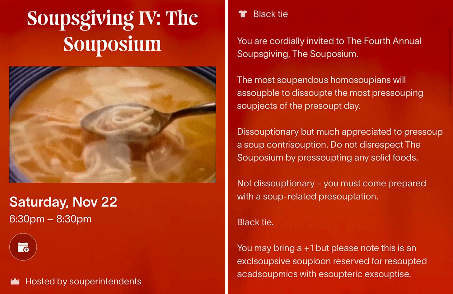 Invitation to the Second Annual Soupsgiving. You may notice here some elements that were jokes at the time but became prophecies of future Soupsgivings.