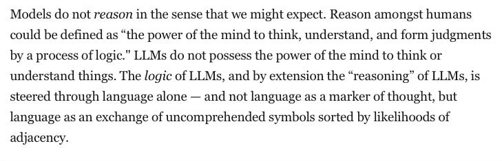 I am aware of and have dipped my toes into the larger debates about consciousness and whether or not we can definitively say whether or not anything is conscious - I’ve read my Daniel Dennett - but these debates, as interesting as they may be in theory are not applicable to the work of large language models. These things do not think, feel, reason or communicate with intention. This is simply a fact of how they work. I shall return to one of my favorite short explainers of this from Eryk Salvaggio and his essay, “A Critique of Pure LLM Reason”: