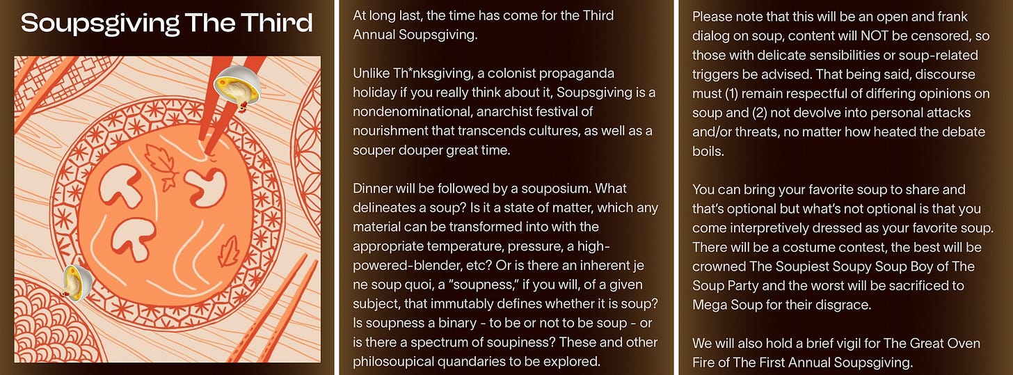 Unlike Th*nksgiving, a colonist propaganda holiday if you really think about it, Soupsgiving is a nondenominational, anarchist festival of nourishment that transcends cultures, as well as a souper douper great time.