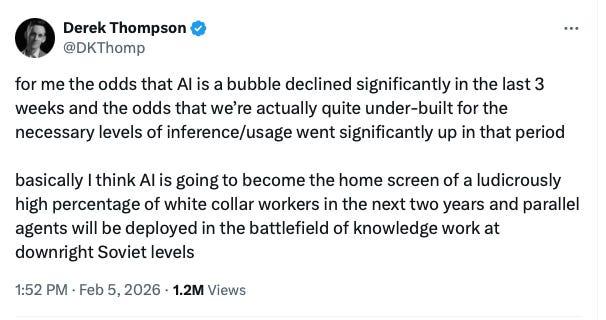 As to why people like Derek Thompson are making massive claims about the future of labor based essentially on personal, anecdotal experience, I think there’s a couple things going on: