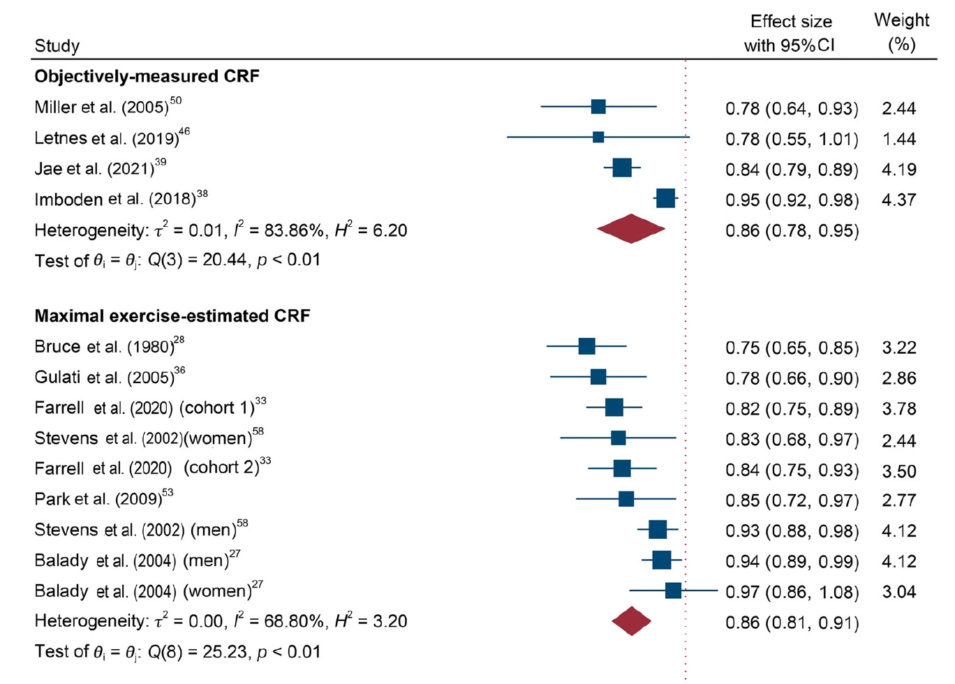 In a 2024 meta-analysis of 42 studies with V02 max (as categorized as “objectively measured CRF”) and estimated CRF for prediction or all-cause and cardiovascular mortality, the results were remarkably similar (cardiovascular mortality, 14% reduction, graph below) but notably there were 234-fold more participants with exercise CRF than by V02 max measurements, or >99% of the data is derived from METS. That is to say, nearly all the data we have for link to outcomes comes from CRF, not V02 max.