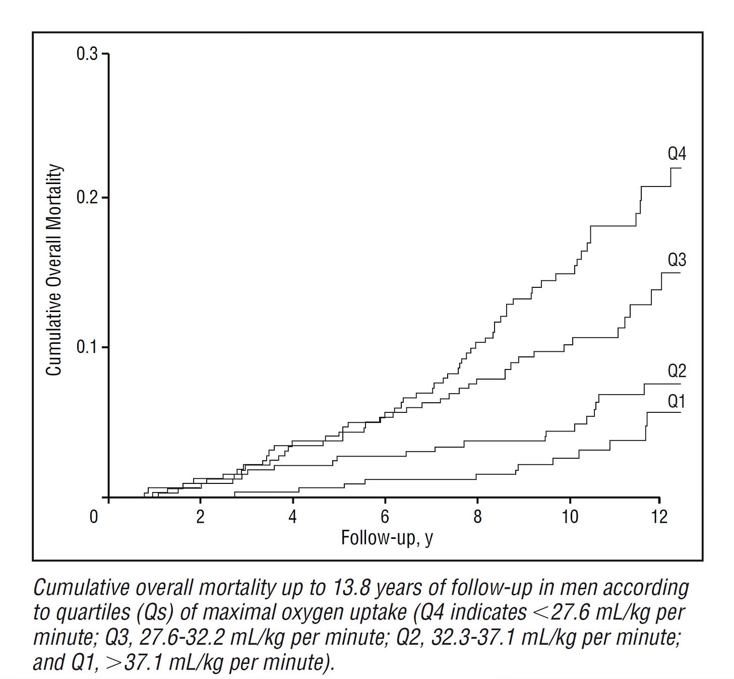 There are limited data for direct measurement of V02 max and outcomes. The 2001 Kuopio study from Finland of 1,294 men with 10.7 year follow-up did measure V02 max directly once at baseline along with a symptom-limited exercise tolerance test on a bicycle ergometer. The relationship of V02 max (by quartiles) to all-cause mortality is shown below.