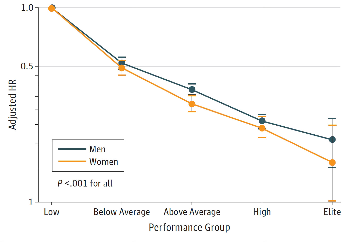 All-cause mortality by sex and the 5 levels of performance are plotted below. The hazard ratio of 1.41 (about 40% increases risk of all-cause mortality) for above average vs below average was the same as the risk of smoking or diabetes. The hazard ratio for mortality from low to elite was more than 5-fold. The favorable impact for women beyond men for METS was seen for each performance group. These results were adjusted for potential confounding variables.