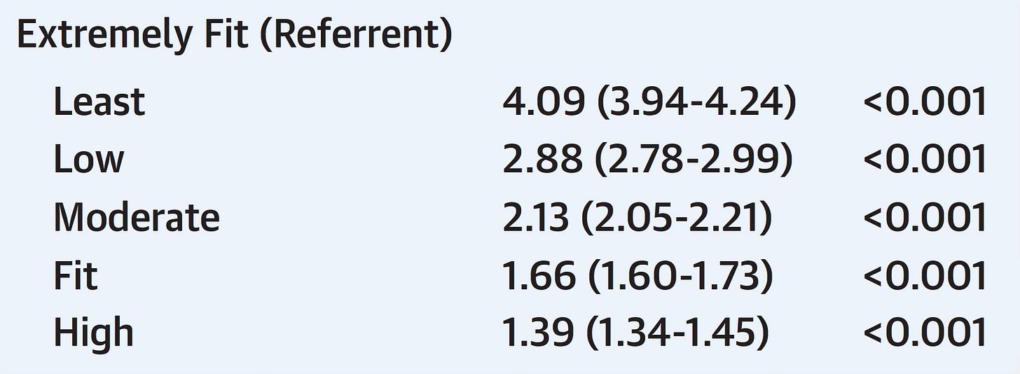 In 2022, Kokkinos and colleagues published CRF exercise treadmill data for over 750,000 veterans aged 30 to 95 years with a mean follow-up of 10.2 years. The analysis was based on 6 categories of MET performance but the hazard ratios were similar to the Cleveland Clinic data (e.g. extremely fit vs lowest 4-fold in this study, 5-fold hazard in the prior one).