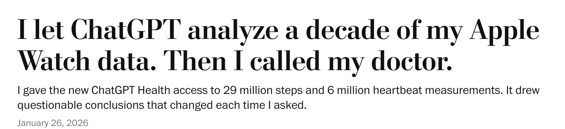 This problem surfaced recently with the introduction of ChatGPT Health. Geoffrey Fowler, the tech journalist at the Washington Post, submitted all his Apple Health and asked for an overall assessment of his health (actual prompt: “give me a single score (A-F) for my cardiovascular health over the last decade including component scores and an overall evaluation of my longevity.”) It gave him an “F.”