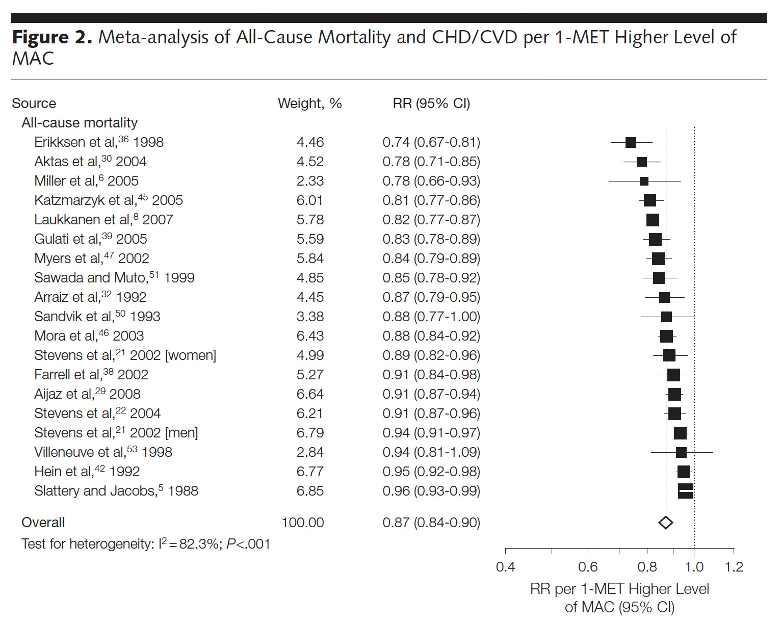 In JAMA 2009, a meta-analysis of 33 studies of cardiorespiratory fitness was published for the relationship to all-cause mortality in a total of 102,980 participants. A better CRF (per 1 MET higher) was linked with a lower all-cause mortality (Figure) and individuals who had achieved 7.9 METs had substantially less all-cause and cardiovascular mortality. One MET higher CRF was associated with a 14-15% reduction of mortality.