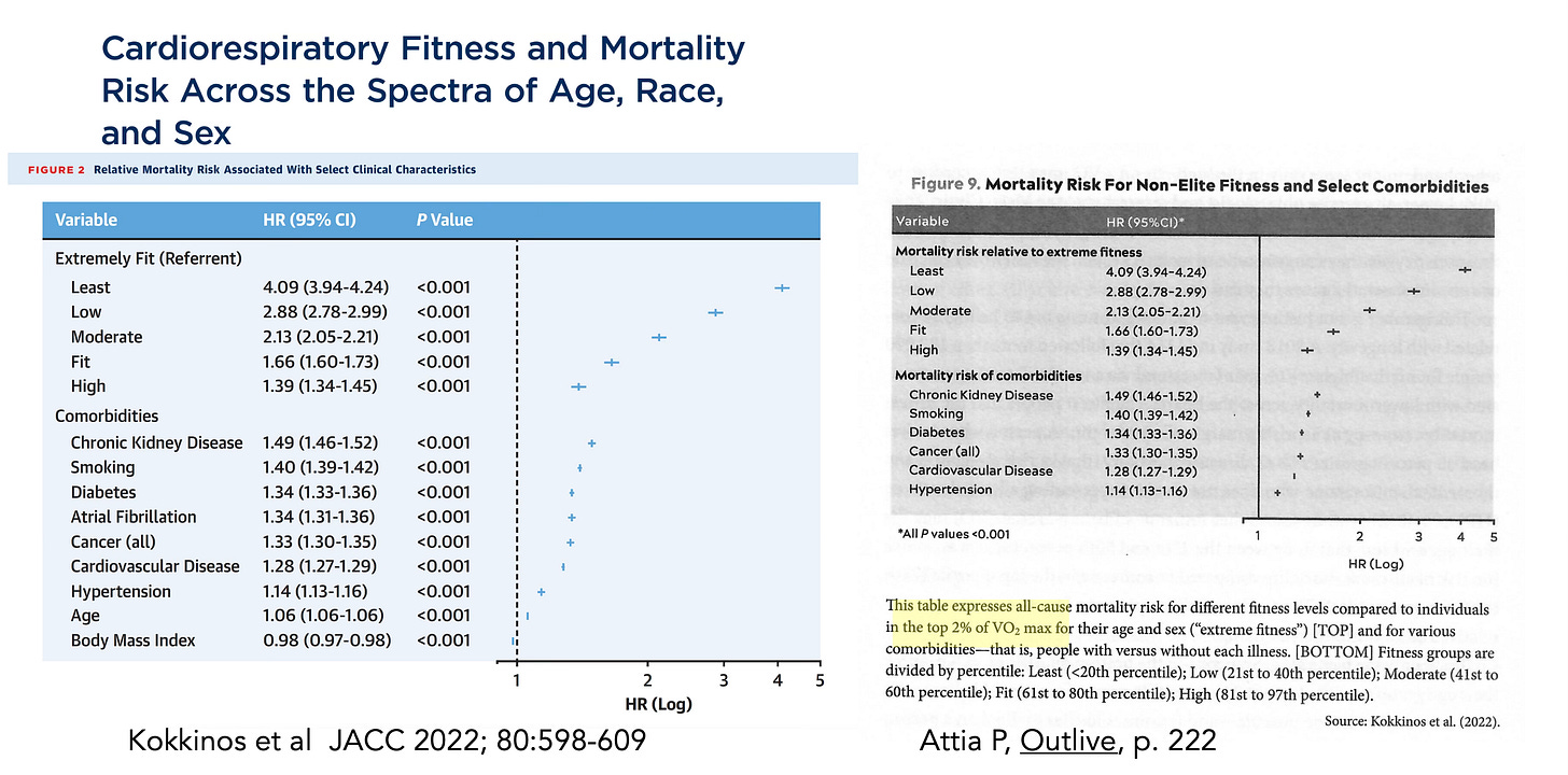 The leading proponent of using V02 max in recent years has been Peter Attia, through his podcast The Drive and book Outlive. He has consistently asserted “V02 max is the singular most powerful marker for longevity.” But the problem is conflation. He cites all of the studies of CRF without measuring V02 max and extrapolates to a V02 max result (see side-by-side Kokkinos study Table and Outlive Figure footnote below) and throughout his discussion of exercise in Chapter 11 of Outlive. For example, he writes: “this number [V02max] turns out to be highly correlated with longevity” citing all studies that did not measure V02 max.