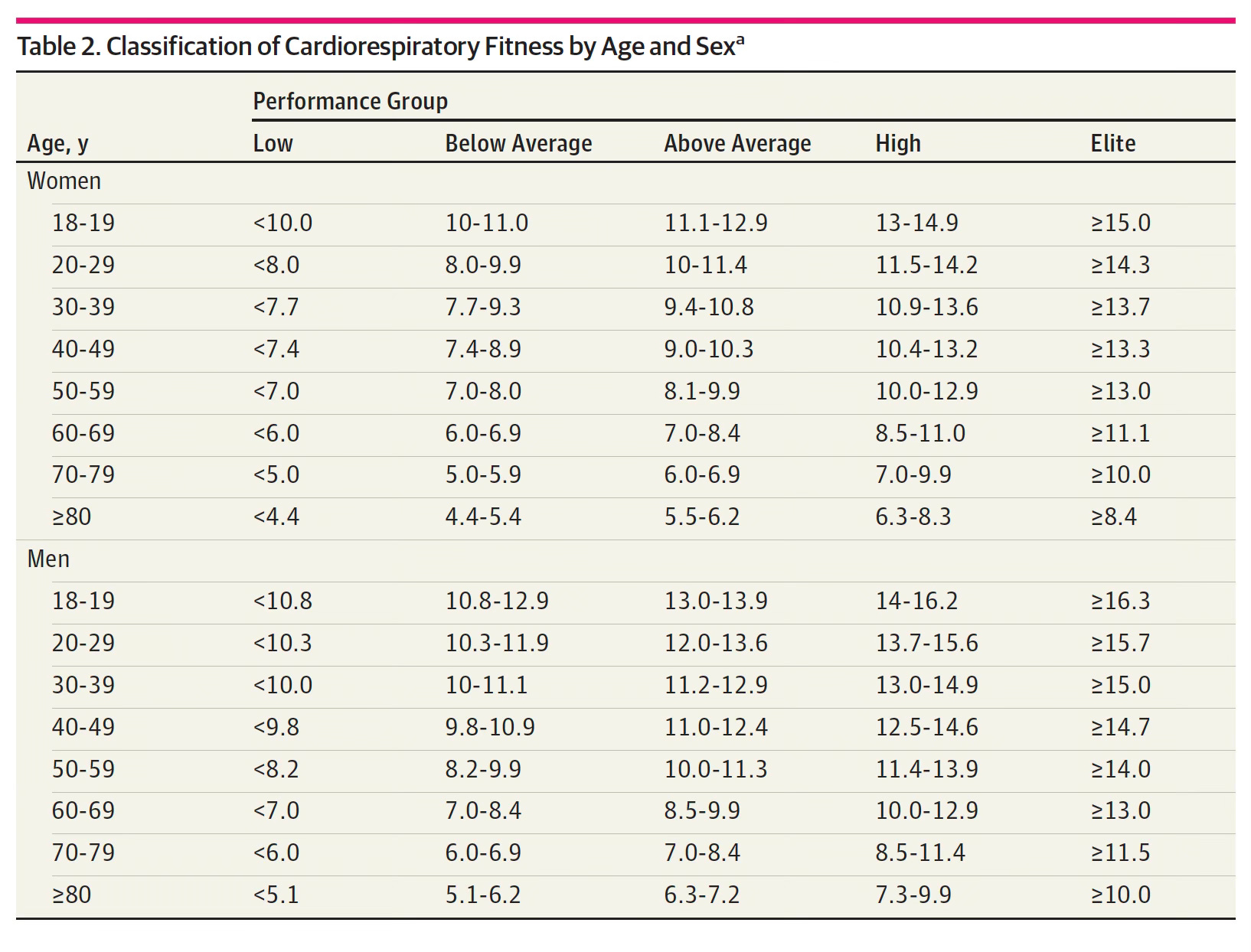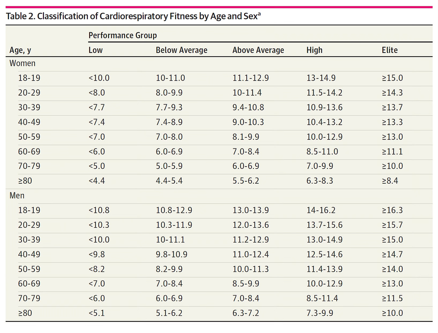 Here is the Table of METS performance by age and sex. You can see there are 5 categories (columns) from low to elite.
