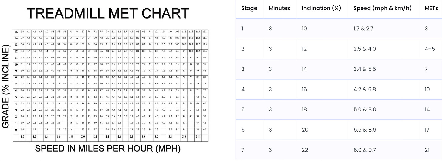 There are multiple methods to calculate your METS, including a standard treadmill MET chart (below left) that plots speed and incline, use a formula if you are doing the Bruce treadmill protocol or the chart below (right), or using heart rate (with any aerobic activity, such as bicycling or jogging) with the formula: METS=0.05 X heart rate+2. So if your HR got to 140 that would be 9 METS. For every increase in heart rate of 10 beats per minute, there’s about a 1 MET increase.