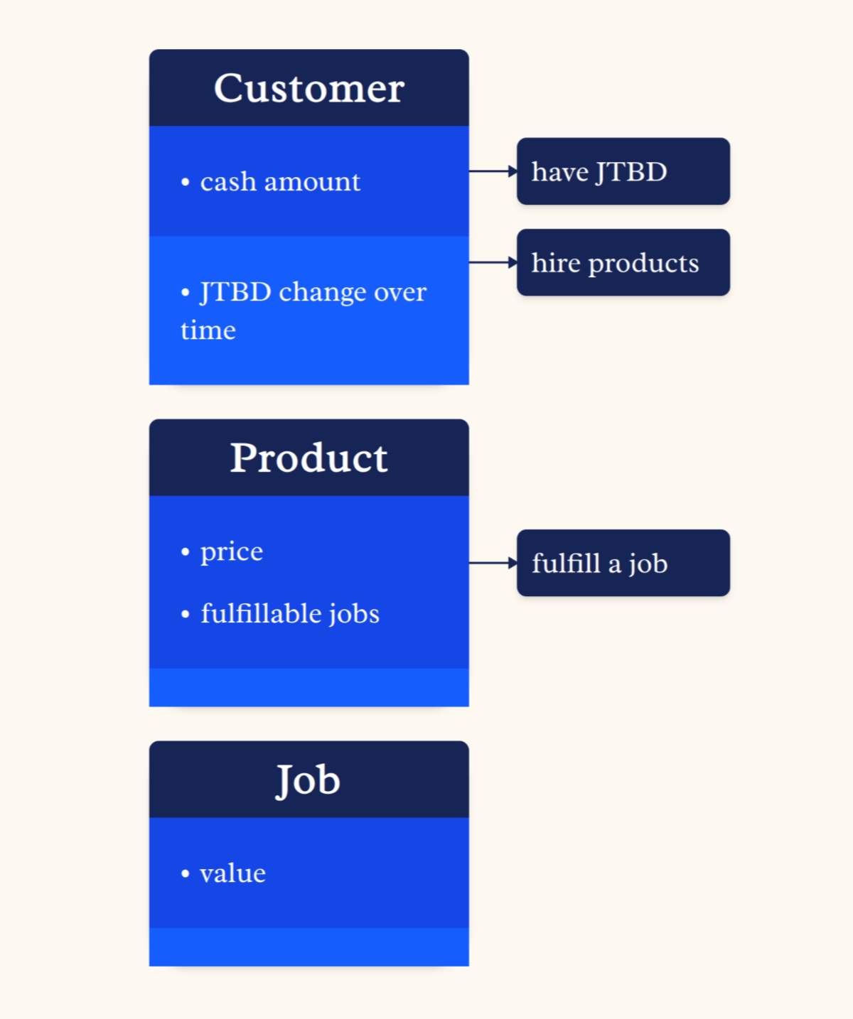 JTBD is a neat mental model proposed by Clayton Christensen to think about business. It shifts the focus from who a customer is or what product they buy, to the underlying "job" they are trying to accomplish. People "hire" products and services to get a job done.