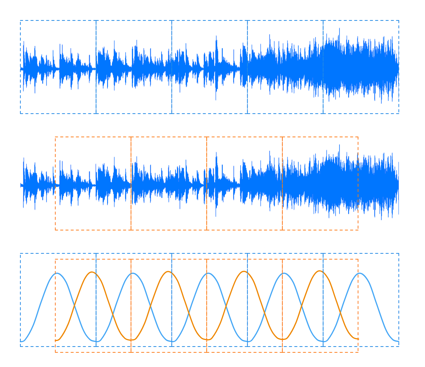 The trick is to also calculate another sequence of “halfway” FFT windows of the same size that overlap the existing ones (second row below):