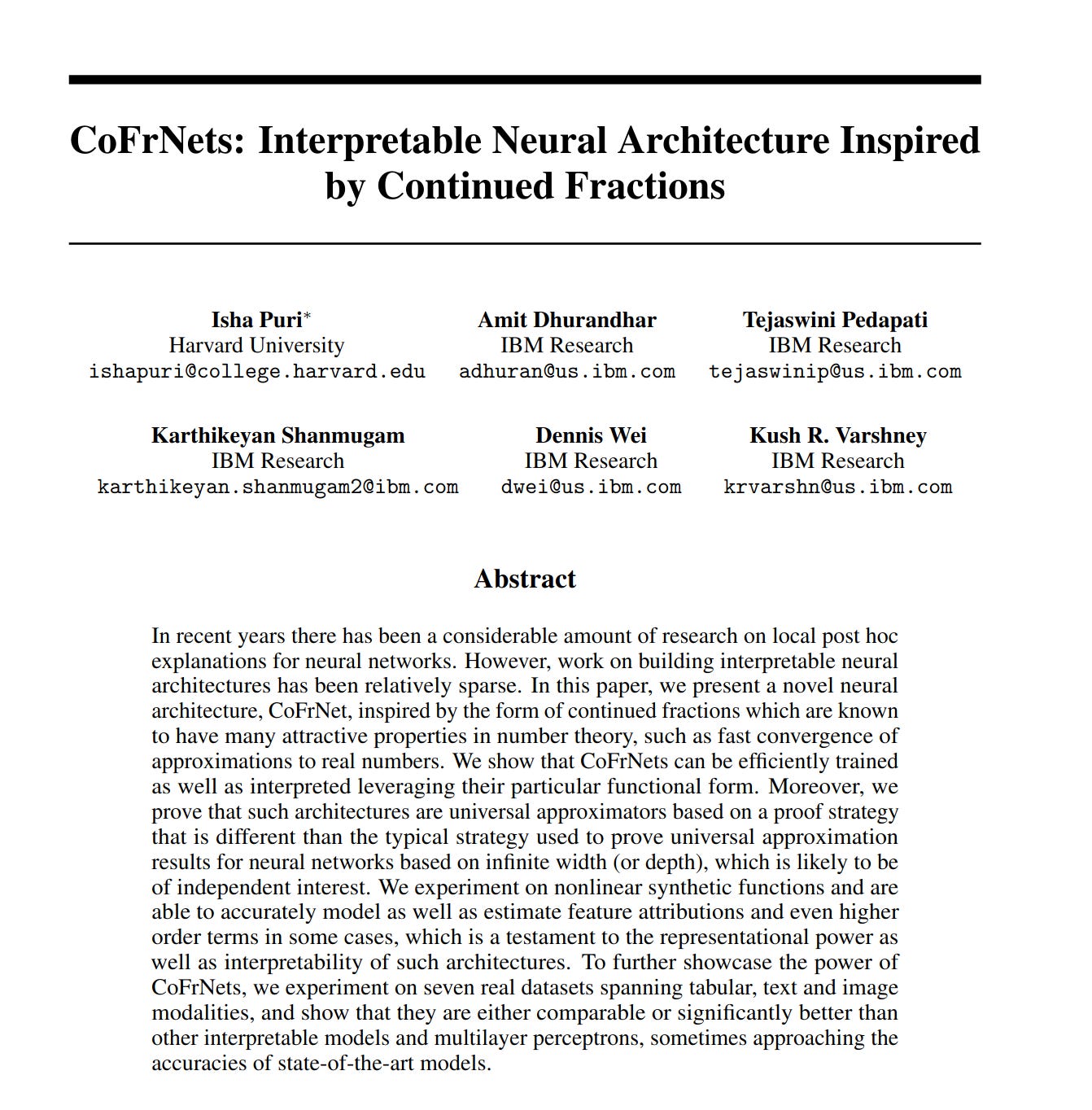 Puri, I., Dhurandhar, A., Pedapati, T., Shanmugam, K., Wei, D., & Varshney, K. R. (2021). CoFrNets: Interpretable neural architecture inspired by continued fractions. In A. Beygelzimer, Y. Dauphin, P. Liang, & J. Wortman Vaughan (Eds.), Advances in neural information processing systems. https://openreview.net/forum?id=kGXlIEQgvC
