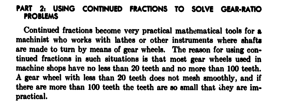 Continued fractions are used to find the best number of teeth for interlocking gears (Moore, 1964)9. If you happen to use the derivative to optimize your fraction selection then you’re affected