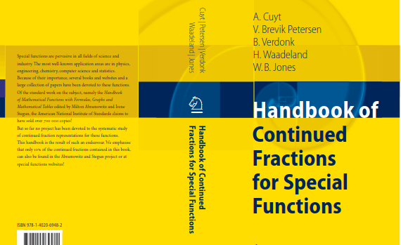 Cuyt, A., Petersen, V. B., Verdonk, B., Waadeland, H., & Jones, W. B. (2008). Handbook of continued fractions for special functions. Springer.