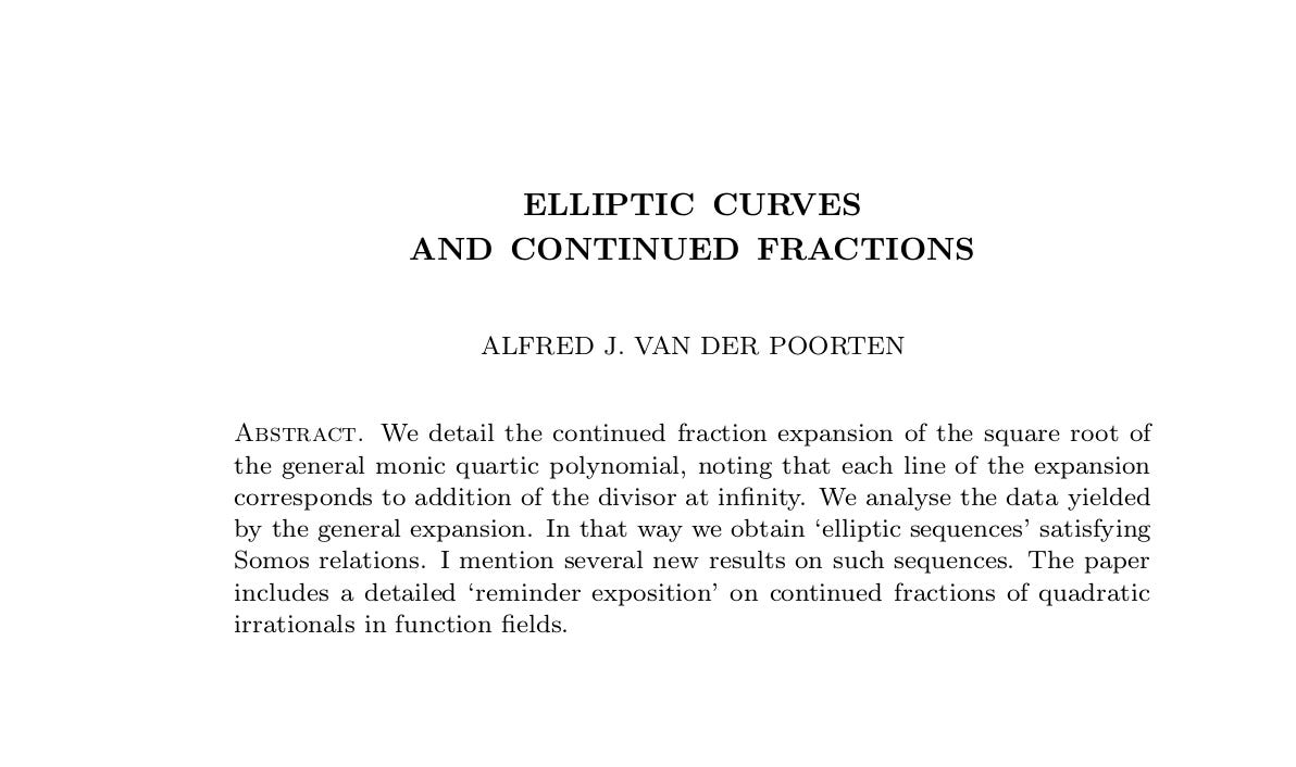 van der Poorten, A. J. (2004). Elliptic curves and continued fractions [Preprint]. arXiv. https://arxiv.org/abs/math/0403225