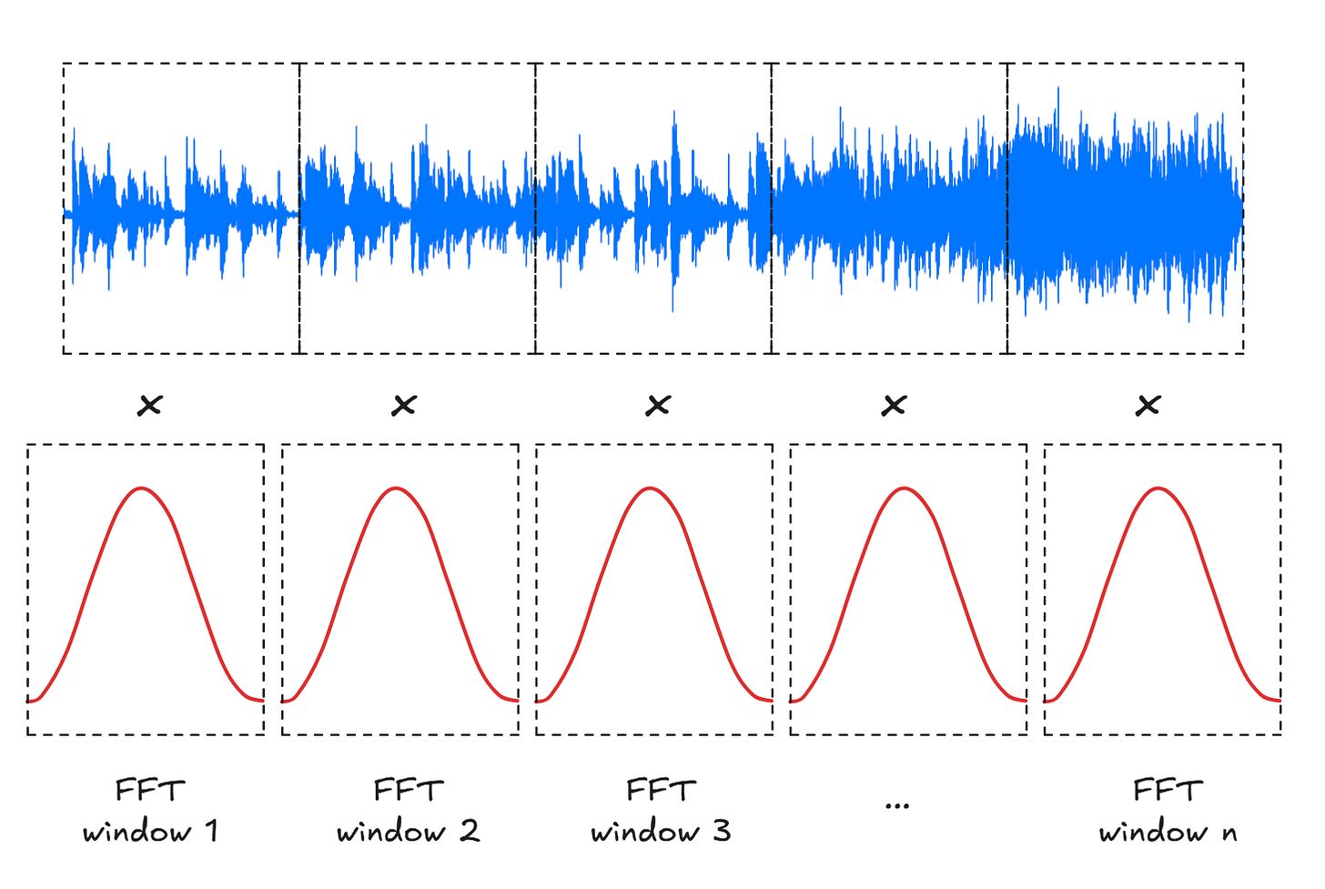 Instead, we need to chop up the track into small slices, typically somewhere around 20-100 ms. This is long enough for each slice to contain a reasonable number of samples, but short enough to more or less represent a momentary “steady state” of the underlying waveform.