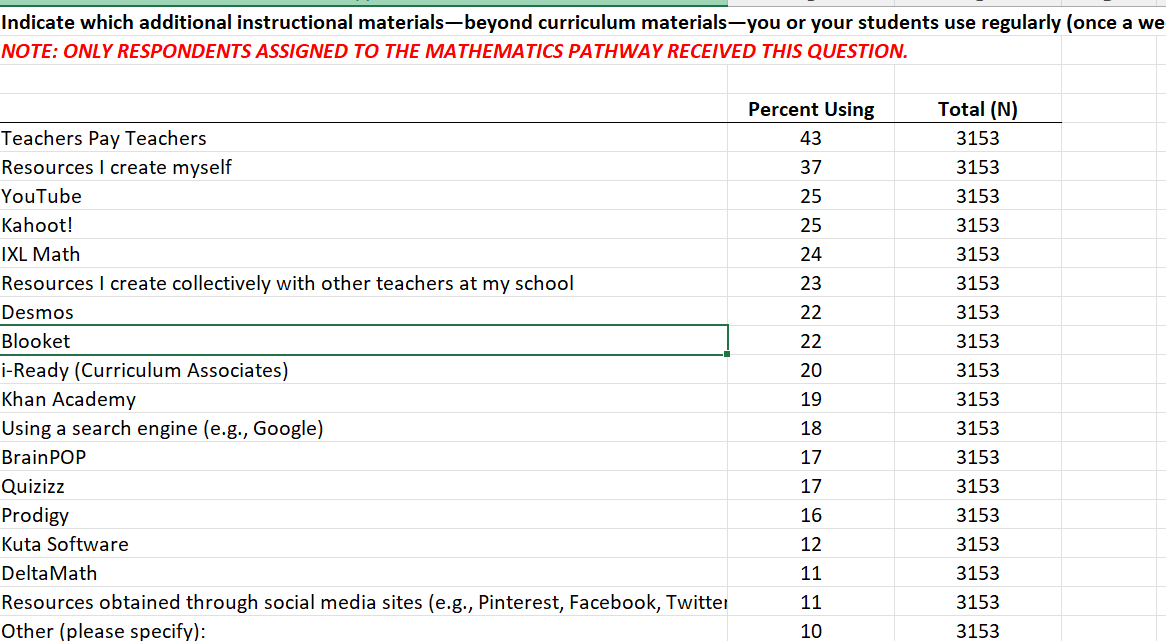 While it’s tricky to figure out how widely Wilson’s curriculum has spread, we can get a bit of a hint from survey results. American Instructional Resources Surveys is a carefully designed survey performed by researchers at RAND that tries to shed light on what resources teachers are using to teach math, ELA, and science. They ask about textbooks and curricula, but also about supplementary materials.