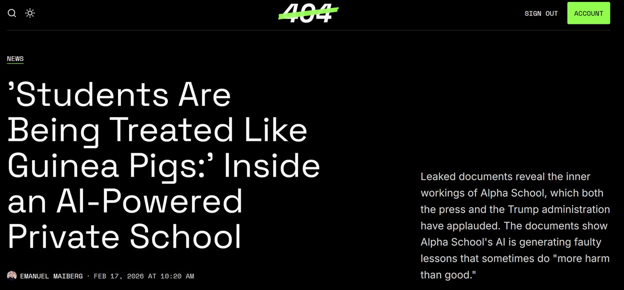 “Former Alpha School employees told me that the company’s increasing reliance on generative AI in every aspect of its operation, as well as the constant monitoring and tracking of every student’s mouse movements, is making students anxious and does not always provide the quality of education Alpha School advertises to parents.