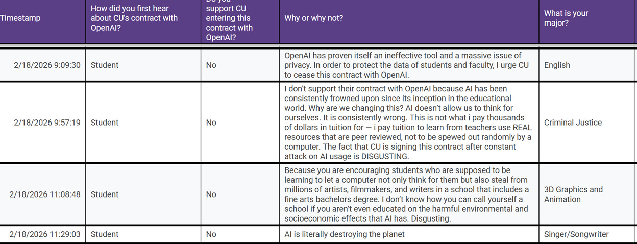 “In an online survey conducted by Flynn Zook, a CU Denver student, nearly 300 respondents weighed in on the agreement. Fewer than 10 expressed clear support, while a small number said they were undecided. Many respondents raised concerns about environmental impact, intellectual property and the potential use of tuition dollars to fund the initiative.” (Story link)
