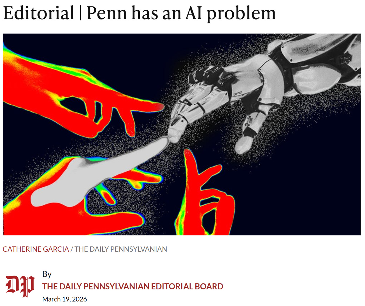 “The irony is that as Penn pours endless money and energy into AI advancement in its attempt to get ahead, the University is only quickening its own demise. AI cannot coexist with education — it can only degrade it. As technology advances and workers are replaced by machines, schools are some of the only places we have left to explore and wrestle with human thought. With our own university leading the charge, AI is now corrupting those few sacred spaces and leaving us with nowhere to engage in true scholarship.”