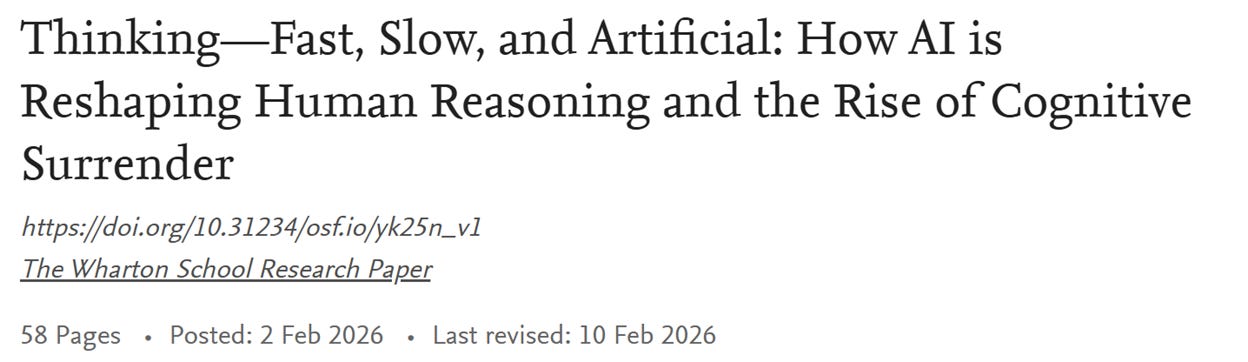 Across our studies, we observe that when System 3 [i.e., AI] was available, people readily engaged it and frequently adopted its answers. This shift reflects a reallocation of cognitive control rather than mere effort saving. System 3’s fluent, confident outputs are treated as epistemically authoritative, lowering the threshold for scrutiny and attenuating the metacognitive signals that would ordinarily route a response to deliberation. In the case of cognitive surrender, there is a shift in the locus of control, with an external system (System 3) occupying the default position.”