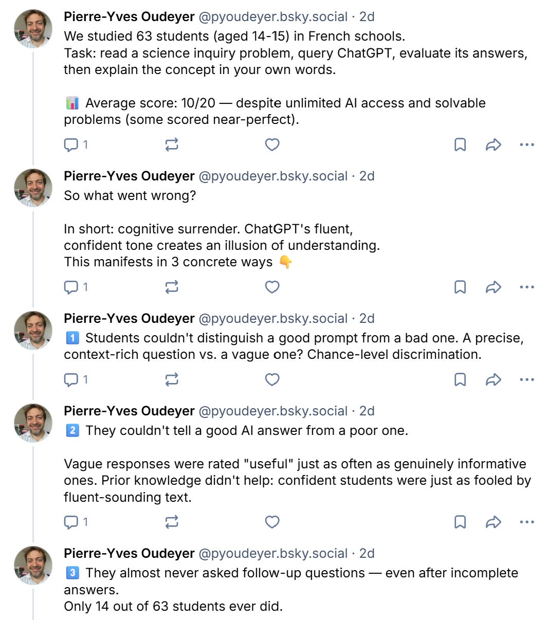 2. Ask the AI-in-education enthusiast if they are familiar with recent research indicating that generative AI leads to widespread “cognitive surrender.”