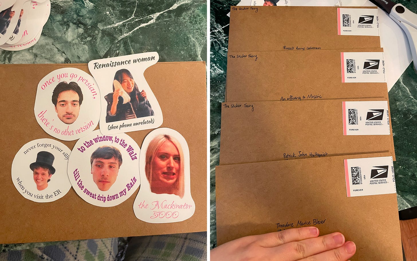 I made stickers of my friends, with relevant slogans. Then I found all of their friends’ addresses that I could. Whether from an old party invite, the time they texted it to me months ago, etc - my only rule was that I couldn’t ask them or their friends directly, I had to scrounge it up. Then I mystery sent the stickers.